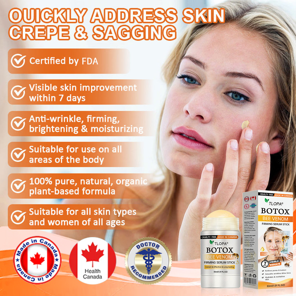 Endorsed by Dr.Sophia, a board-certified dermatologist with over 10 years of expertise in skincare,TLOPA® Botox Bee Venom Firming Serum Stick comes highly recommended. This exceptional product provides an ideal remedy for an array of skin issues, including neck lines, sagging arms, drooping breasts, chest discomfort, stretch marks, cellulite on the abdomen, thighs, and buttocks, as well as sagging buttocks, among others. Importantly, it achieves these results without any adverse side effects. Crafted entirely from 100% natural plant extracts, this cream is suitable for all skin types, including sensitive skin.