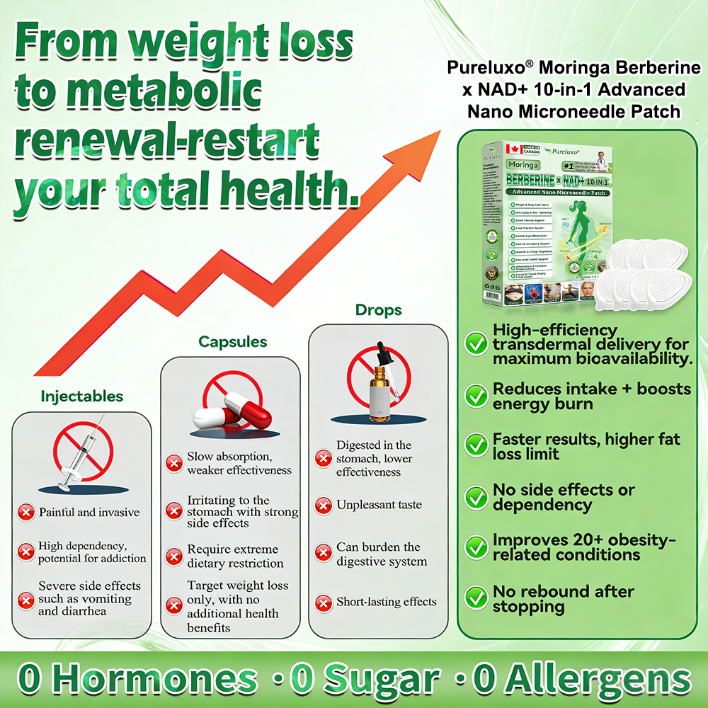 Pureluxoยฎ ๐๐จ๐ซ๐ข๐ป๐ด๐ฎ ยท ๐๐๐ซ๐๐ฒ๐ฟ๐ถ๐ป๐ฒ ร ๐ก๐๐+ ๐๐ ๐ข๐ง ๐ ๐๐๐ฏ๐๐ง๐๐๐ ๐ก๐ฎ๐ป๐ผ ๐ ๐ถ๐ฐ๐ฟ๐ผ๐ป๐๐๐๐ฅ๐ ๐๐๐ญ๐ฐ๐ต is developed through 20+ years of research by over 30 experts and designed for all adults and body types. Powered byย Berberine and natural extracts, this nano microneedle patch delivers active ingredients through the skin to support healthy blood sugar balance, appetite control, and fat metabolism for gradual, sustainable weight management โ no pills or injections required.ย Enriched with Collagen Peptides, it helps maintain skin firmness during slimming while also supporting digestion, gut and womenโs health, energy levels, fatigue reduction, and overall metabolic balance.ย Manufactured in GMP-certified facilities underย Canadian and EU standards, it offers a safe, science-backed, needle-free solution for effective weight control and daily wellness.